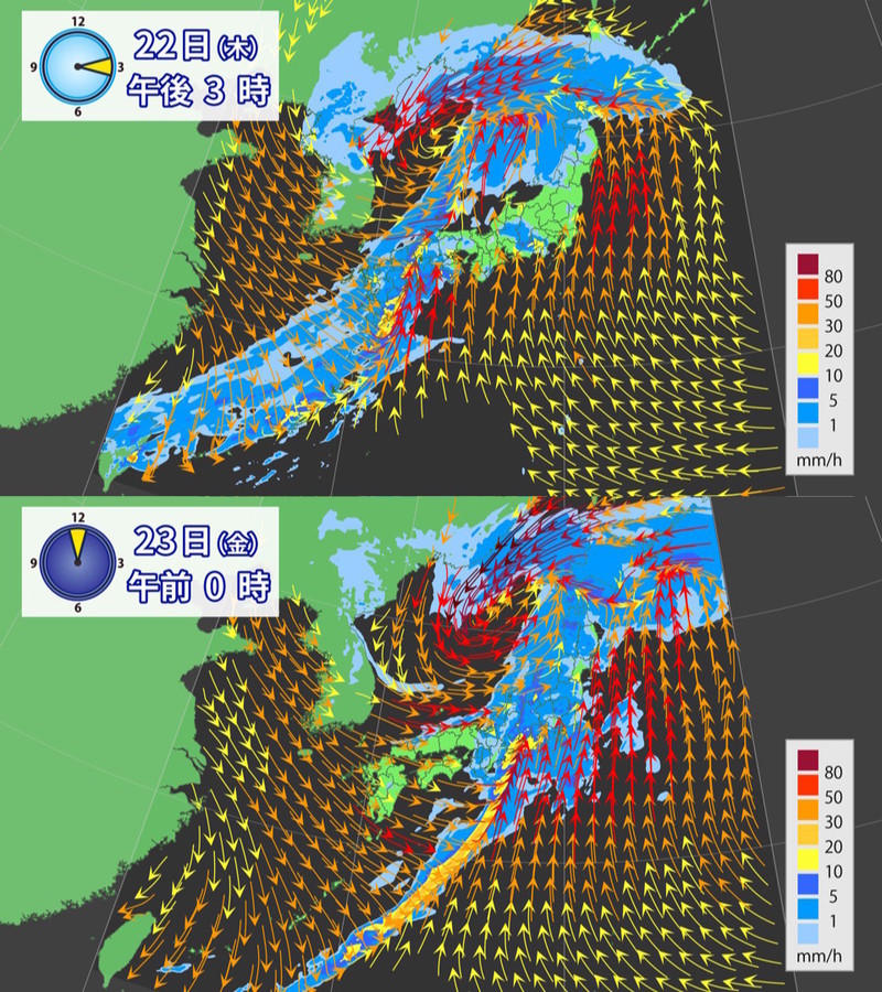 受朝鲜半岛前线附近的低气压影响,22日日本全国刮起强烈的台风,预计明后日在日本海有超高的大浪,风速达到35m/s,北海道地区伴有大雪,预计60cm的降雪量,日本全国各地或有暴风、暴雨、暴雪、雷电和超高的大浪,甚至出现龙卷风。