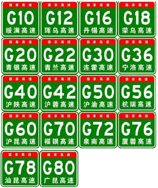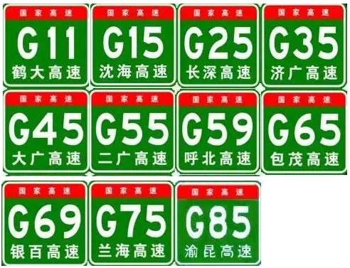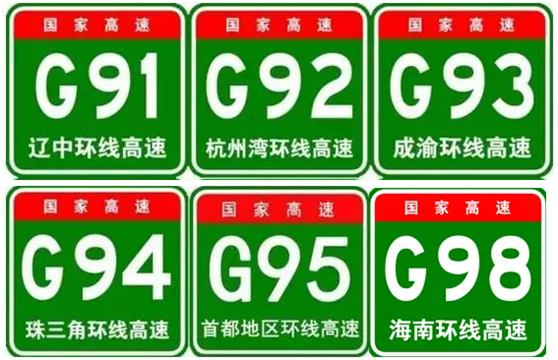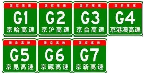 其次,G字母是国字头,编号由G+阿拉伯数字组成,G+1位数是首都放射线,G+2位奇数是纵线,G+2位偶数是横线。还有地区环线、并行线和联络线。