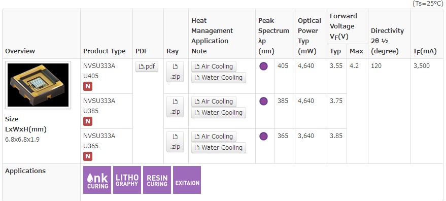 此外,日亚化学还发布了另外两款用于UV固化的高功率UVLED产品。